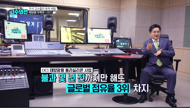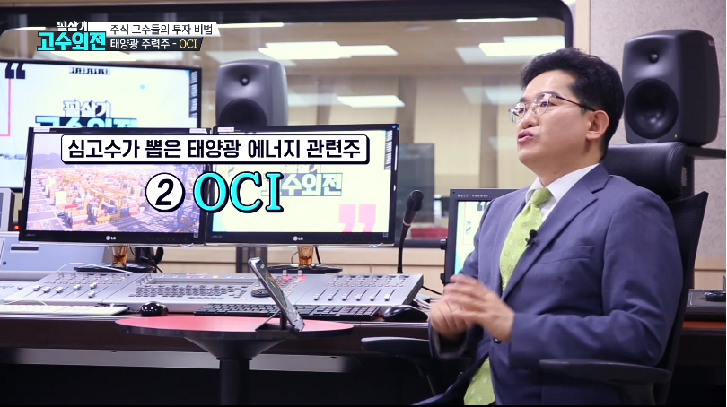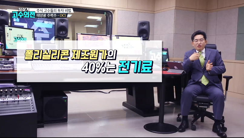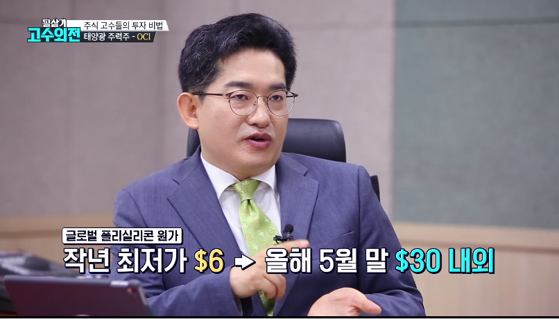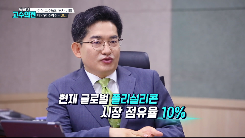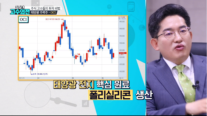 필살기 고수외전 심우재 고수가 알려주는 주식 고수들의 투자비법 태양광 주식 추천종목 두 번째는 OCI입니다. OCI는 태양광 전지 핵심 원료인 폴리실리콘을 생산하는 회사인데요.