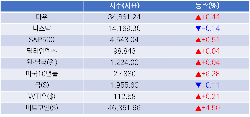 반면 엔비디아(-1.63%), 테슬라(-0.33%), 넷플릭스(-0.50)%, 마이크로소프트(-0.14%) 등은 하락장에 거래를 마쳤습니다. 이날 월스트리트저널(WSJ)은 씨티그룹과 뱅크오브아메리카를 포함한 여러 은행의 경제학자들이 향후 회의에서 연준이 금리를 0.5%포인트 인상할 가능성을 열어뒀다고 밝혔고, 이에 국채금리는 연준의 금리 인상 가능성을 반영하며 상승해서 이날 10년물 미국 국채 금리는 전 거래일 종가 2.341%에서 상승한 2.488%를 기록했는데, 장중 한때는 2.5% 선을 넘기기도 했습니다.