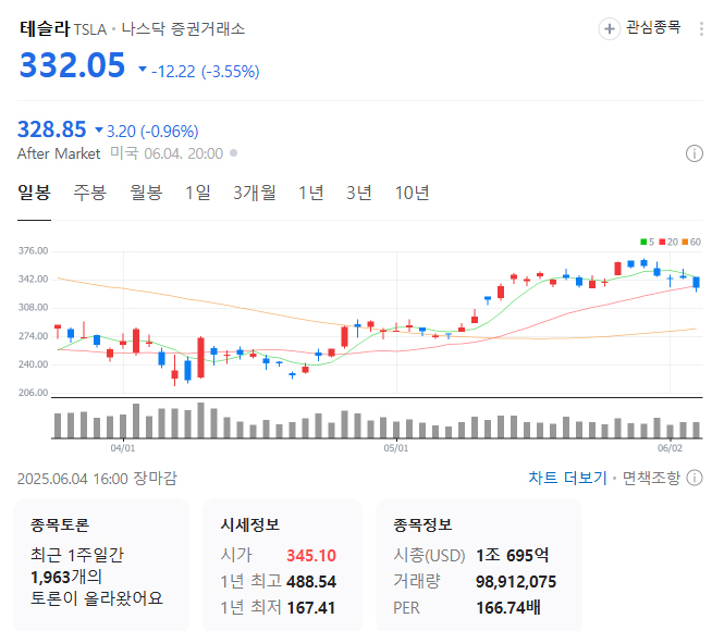6월 4일(현지시간), 뉴욕 증시에서 테슬라 주가는 전 거래일 대비 3.55% 하락한 332.05달러에 마감했습니다. 이는 테슬라의 시가총액을 1조 달러 아래로 끌어내린 수준으로, 투자자들 사이에서는 머스크와 트럼프 간 갈등이 테슬라에 불이익으로 작용할 수 있다는 우려가 반영된 결과로 해석되고 있습니다.